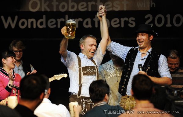 10月30日,一名外国友人在长春啤酒狂欢节现场参与互动。